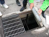 グレーチングを縦に落として、その前に板を落として水をせきとめ、水たまりをつくって水を汲み出す。消防水利用は黄枠で表示。