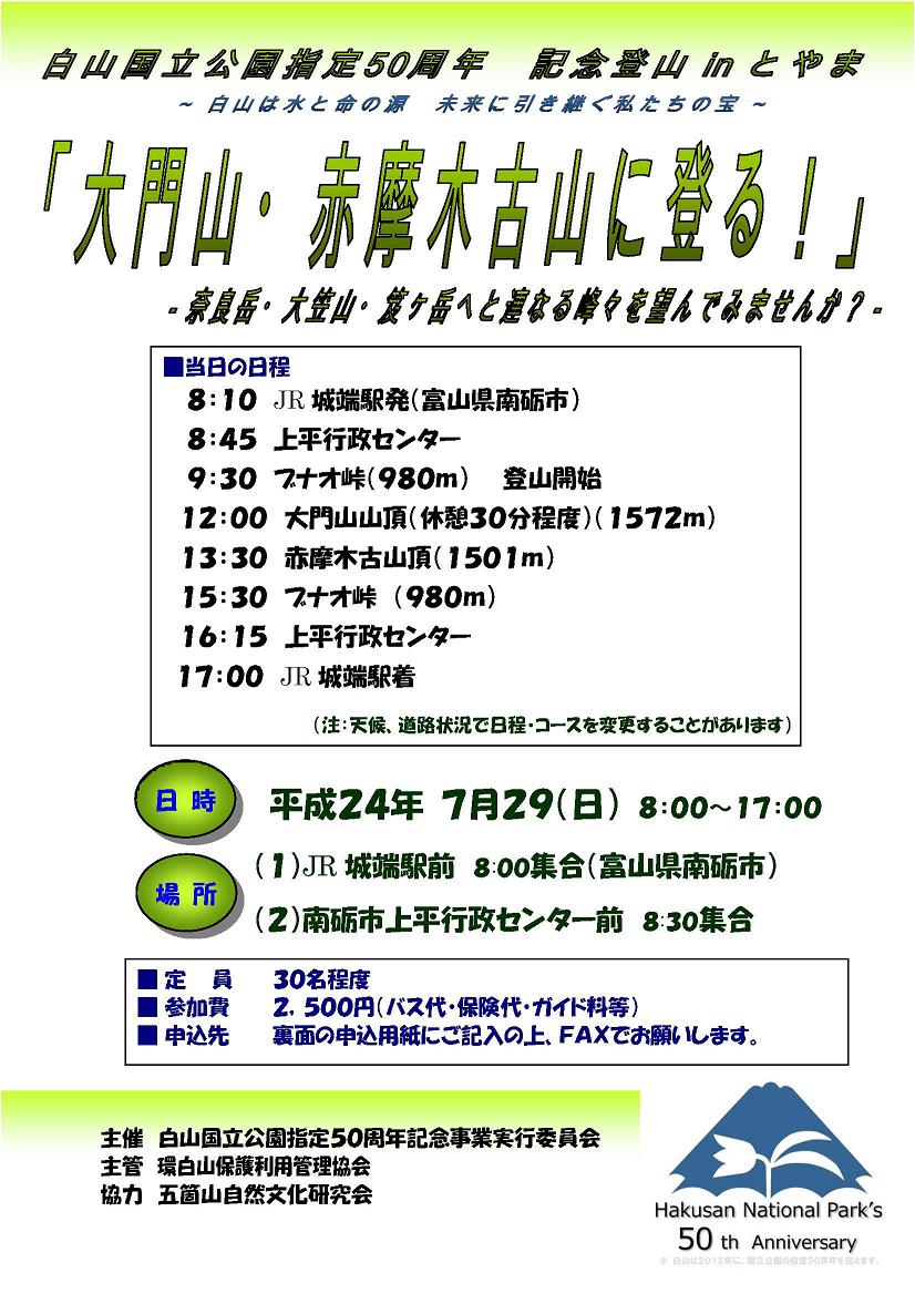 7月29日(日)白山国立公園50周年記念登山教室(富山)『大門山・赤摩木古山に登る!』が開催されます。定員30名程度。参加費は2,500円です。
