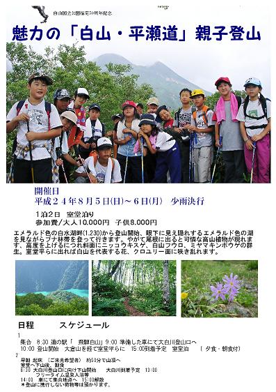 8月5日(日)〜6日(月)に白山国立公園50周年記念登山教室(岐阜)『魅力の「白山・平瀬道」親子登山』(1泊2日、少雨決行)が実施されます。