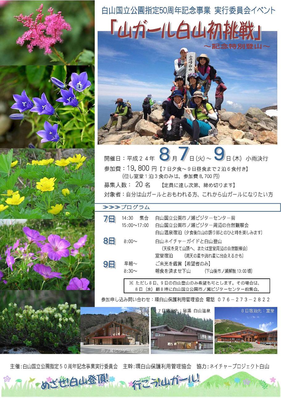 8月7日(火)〜9日(木)白山国立公園50周年記念登山教室(石川)『山ガール白山初挑戦』が行われます。