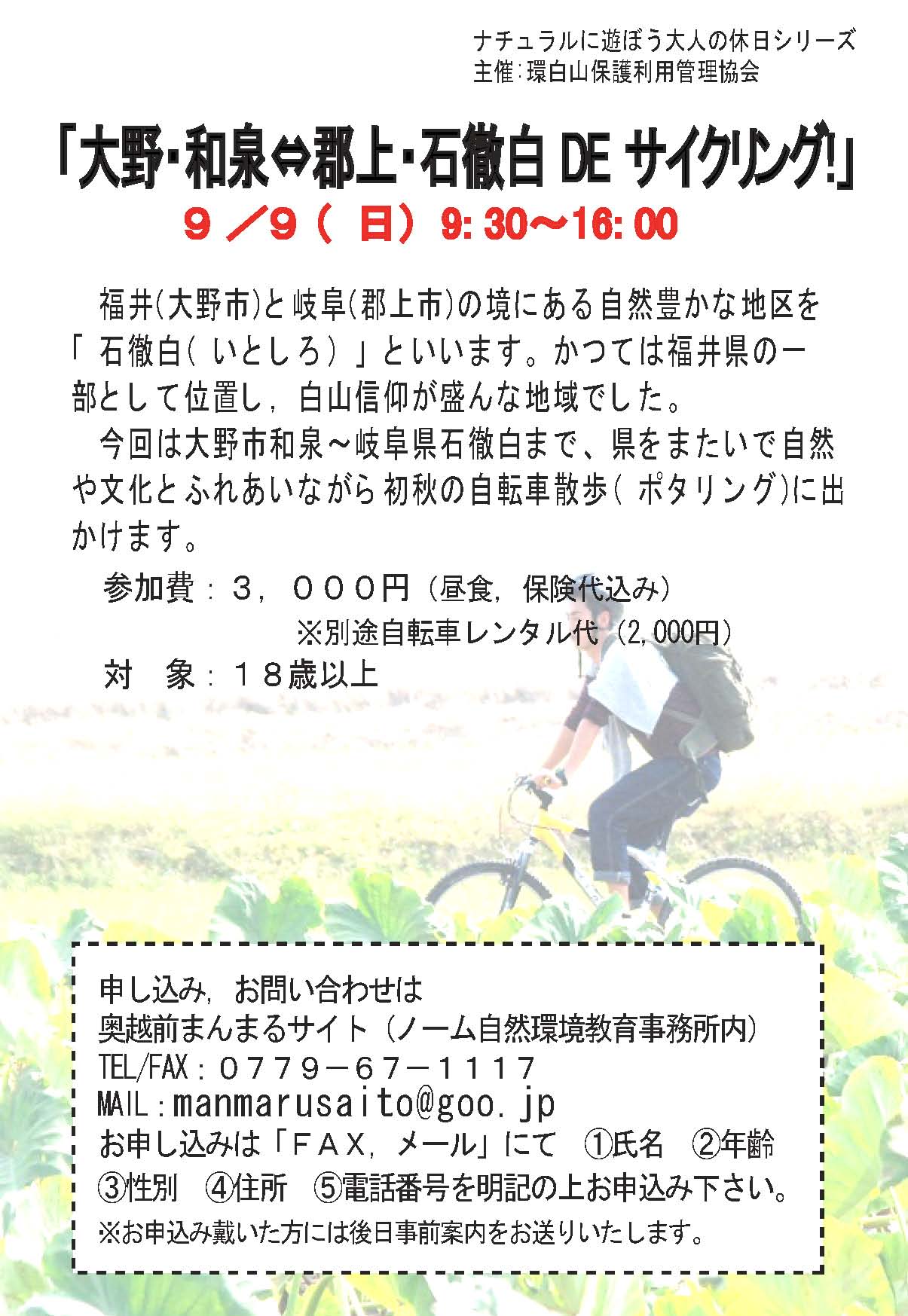 福井県大野市和泉〜岐阜県郡上市石徹白まで、県をまたいで、自然や文化とふれあう「自転車散歩(ポタリング)」の旅です。