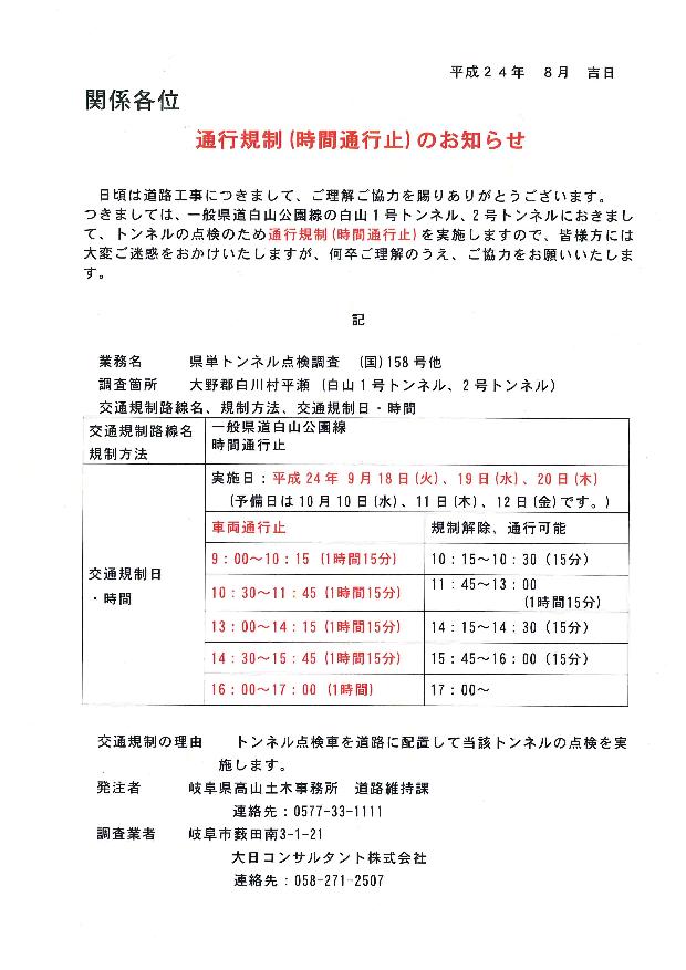 9月18日(火)〜20日(木)にかけて県道白山公園線(岐阜県側)の白山1号トンネル及び2号トンネルにてトンネル点検作業のため、通行規制(時間通行止)が実施される予定です。時間等詳細については添付資料をご確認ください。当日通行される方はお気をつけ下さい。