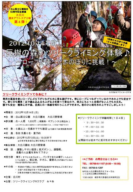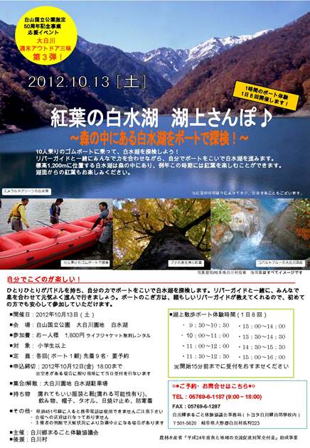 白川村では白山国立公園指定50周年記念事業の一環として、秋の大白川園地を満喫いただける3つの自然体験イベントと大白川野営場の割引キャンペーンを企画しました。13日〜14日は、Eボートによる白水湖の湖上さんぽとツリークライミング体験を実施します。秋の週末、ぜひ、大白川の雄大な自然に抱かれる休日をおたのしみください。